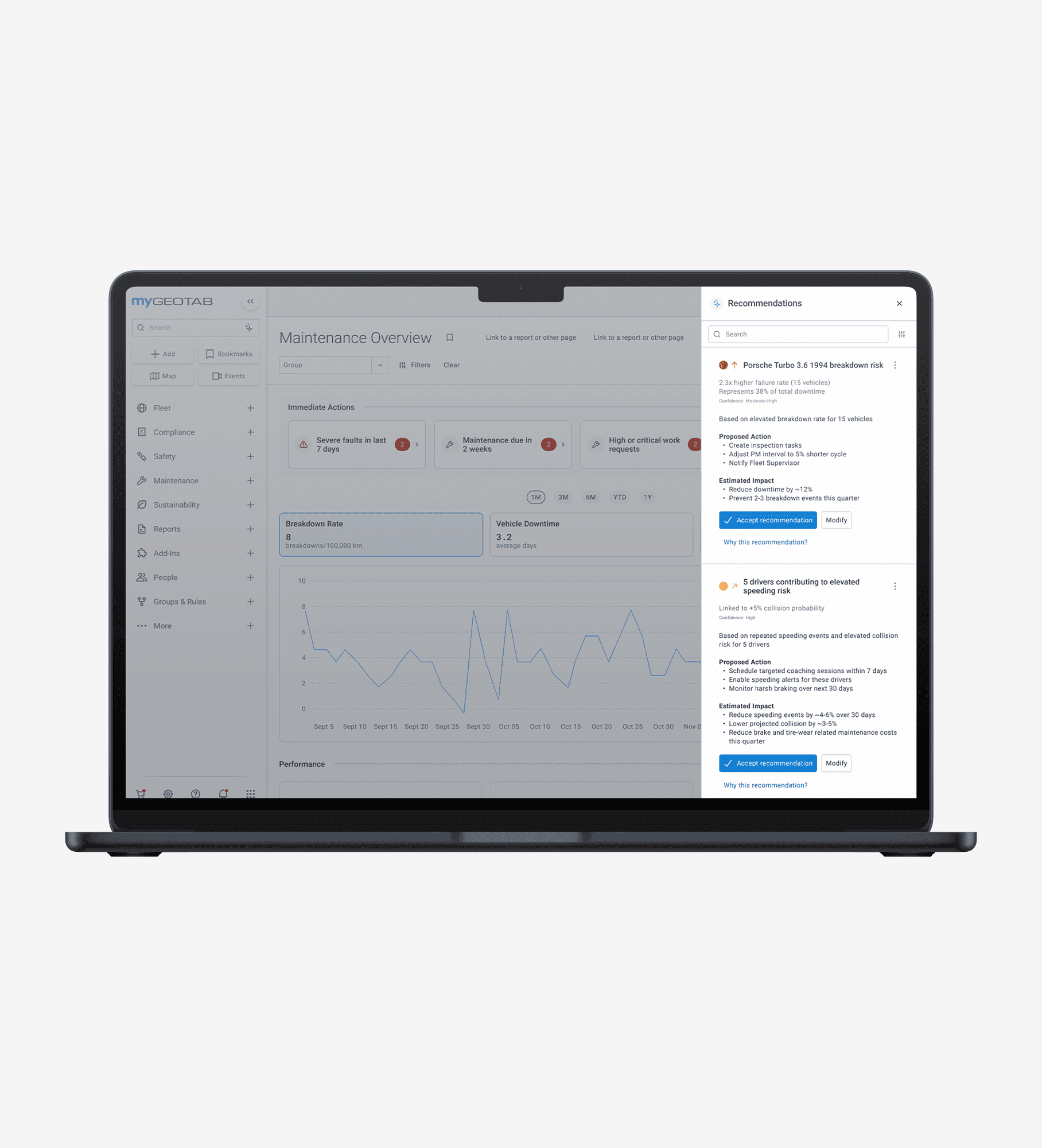 Geotab’s maintenance workflows generated high volumes of raw data, but insights were fragmented and required manual interpretation. Users were forced to scan reports and dashboards to extract operational meaning, which slowed decision-making and increased risk.
