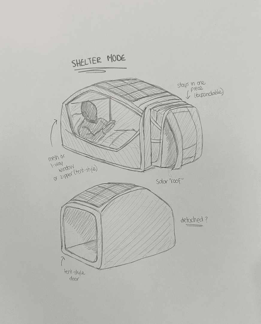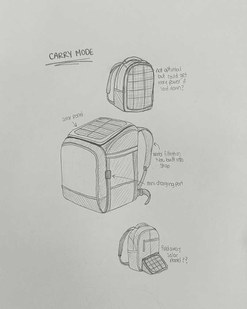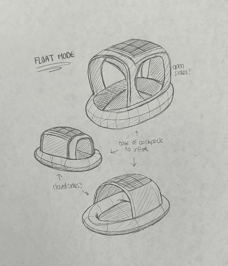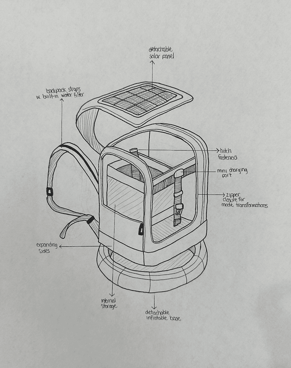 A lightweight, ergonomic backpack that transforms into multiple survival modes as conditions evolve: Carry -> Shelter -> Float By integrating features like solar panels for power and filtration for clean water, the backpack can provide immediate support through every stage of an emergency.